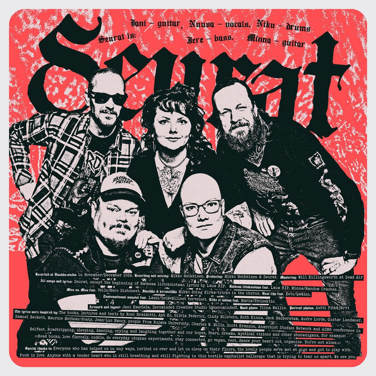 Formed in 2018 after a coffee meeting in Oulu, Seurat began as a political hardcore punk project driven by frustration and the desire to imagine otherwise. From their first gig at a lakeside DIY fest in Kainuu to tours across Europe, their approach has remained anchored in anarchist poetics, bodily resistance, and the search for new modes of living. This year they release Lihan uusi runousoppi (“New Poetics of the Flesh”)—their fourth release and second album.