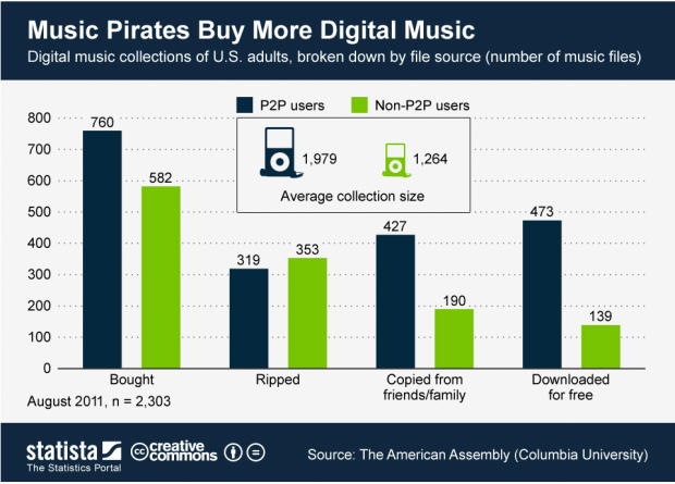 Statista have posted a very interesting chart breaking down the average digital music collections of U.S. adults (P2P users and non-users), by file source. It shows that file-sharers buy significantly more digital music than non-P2P users.