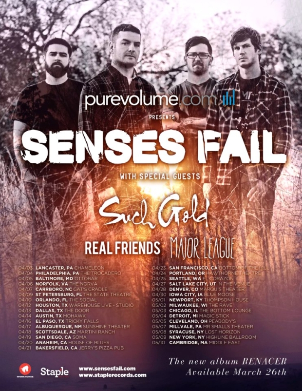 SENSES FAIL today announce an extensive US headline spring tour in support of their upcoming album, “Renacer” (ray-nah-serr) which will be released on March 26, 2013 on Staple Records. The tour is presented by PureVolume.com and includes support from SUCH GOLD, REAL FRIENDS, and MAJOR LEAGUE. The tour kicks off April 3, 2013 in Lancaster, Pennsylvania and currently wraps on May 11 with a special New Jersey-area show that will be announced in the coming weeks.