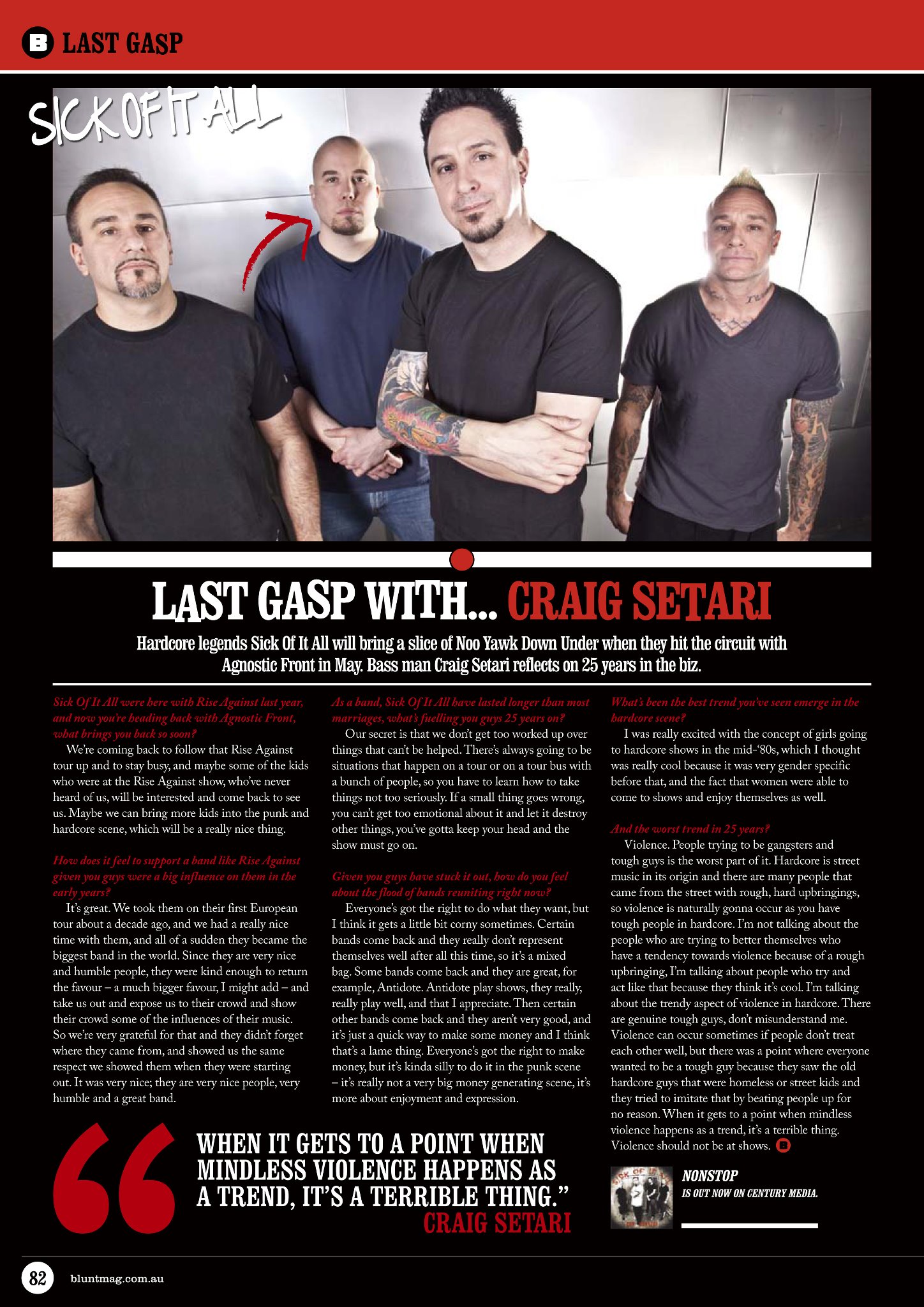 Interviews STARE SICK OF IT ALL interviewed by Blunt magazine April 14, 2012 1 min read Blunt magazine did an interview with SICK OF IT ALL bassist Craig Setari: Click the image to enlarge. Share this Facebook Messenger Twitter Whatsapp Reddit Email Tags: hardcorehardcore punknyhcsick of it all Karol Kamiński DIY rock music enthusiast and web-zine publisher from Warsaw, Poland. Supporting DIY ethics, local artists and promoting hardcore punk, rock, post rock and alternative music of all kinds via IDIOTEQ online channels. Contact via [email protected] You might be interested in February 10, 2013 BAD RELIGION bassist interviewed by AMP Magazine, February 2013 February 10, 2013 STCIK TO YOUR GUNS interviewed by I Want My C TV February 9, 2013 PARKWAY DRIVE interviewed by PitCam February 9, 2013 The Self-Titled Magazine talks to HOT WATER MUSIC Previous Story ARCHITECTS interviewed by Dead Press, March 2012 Next Story EXCLUSIVE: OUR FRIEND, SURRENDER interview Latest A split EP born from Myspace friendships and two decades of shared emo memory An intercontinental 5-way screamo split arrives with new tracks from Jamais Vu, Razones para el olvido, Portia, Löri, and Ümit ONLY stare straight into the burn of modern life on “Eyes Wide Open” Two members of LOWER AUTOMATION step into a new world of noisy industrial distortion on the first Grave Gnaw EP RISE OF THE NORTHSTAR map out the full “Chapter 04: Red Falcon Super Battle! Neo Paris War!!” universe with a track-by-track look inside