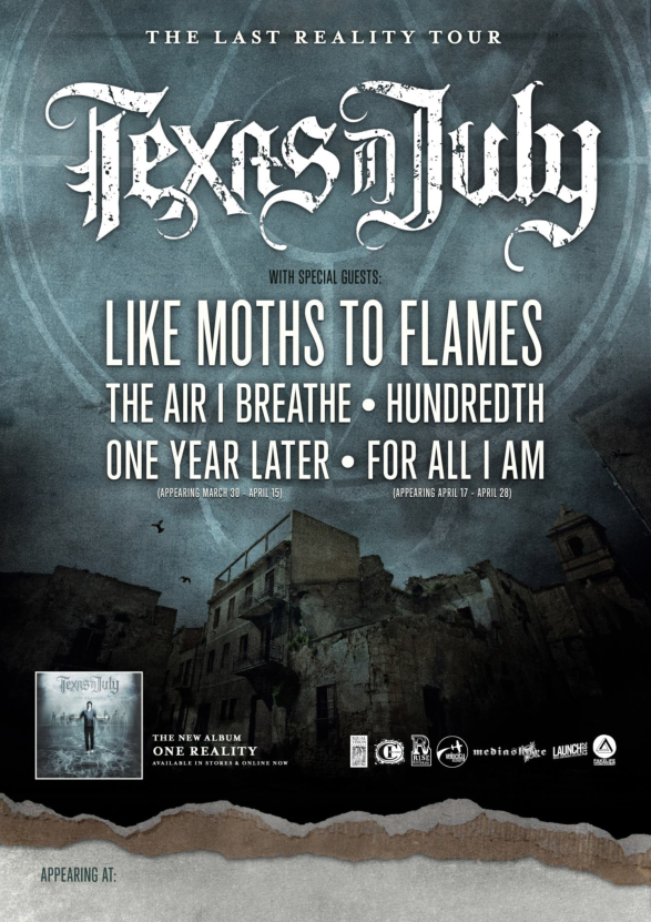 TEXAS IN JULY‘s first headlining tour will feature support from LIKE MOTHS TO FLAMES, THE AIR I BREATHE, HUNDREDTH, FOR ALL I AM and ONE YEAR LATER.