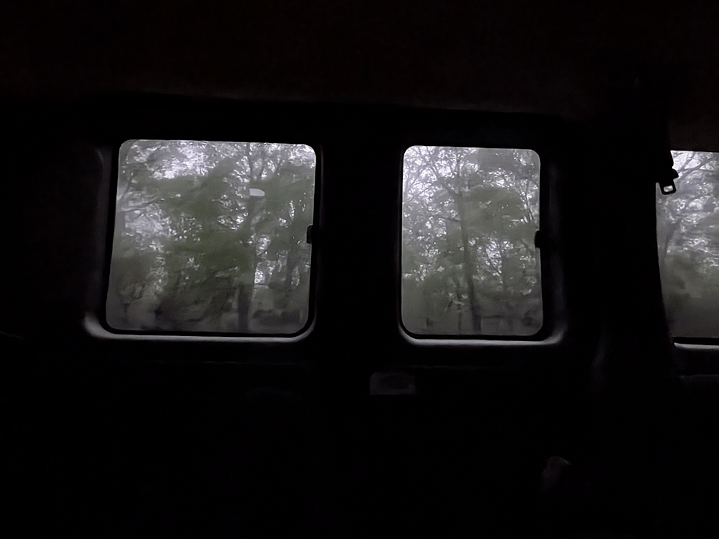 Two songs into our set, the people who run the venue told us to stop playing because the tornado had touched down near us. That was great. We moved all of our stuff into the shed and were going to make a run for the house, but the owner told us it was too late and we should stay in the shed. We’re not from tornado country, so we weren’t sure what to think. We definitely thought we were going to die for a brief period. Once everyone assured us that the worst had passed us by, we rushed to load all of our gear and merch into the trailer. Ethan then drove us an hour and change to a hotel in Huntsville through an intense thunderstorm. In the end, we were obviously fine but it was very scary in the moment. Here’s a picture of the lightning. Keep in mind it was pitch black outside.