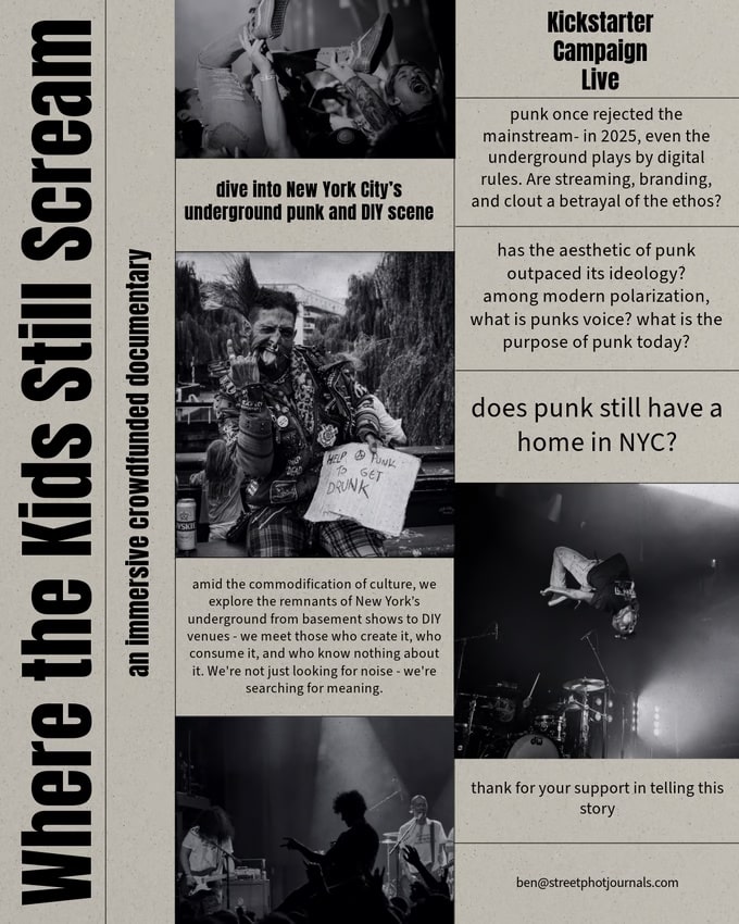 Filmmaker Ben Devenezia has two weeks left on the Kickstarter campaign for Where the Kids Still Scream, a raw, ground-level documentary that examines whether punk in New York City still has a pulse—or just a playlist. With cameras already rolling, the doc pushes into the places where basement shows still happen, and the memories that didn’t make it to tape.